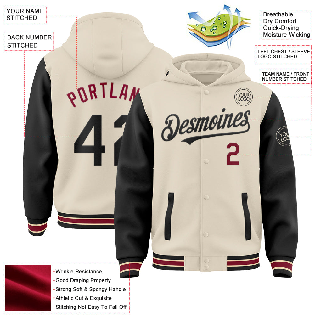 Custom Cream Black Crimson-City Cream Bomber Full-Snap Varsity Letterman Two Tone Hoodie Jacket