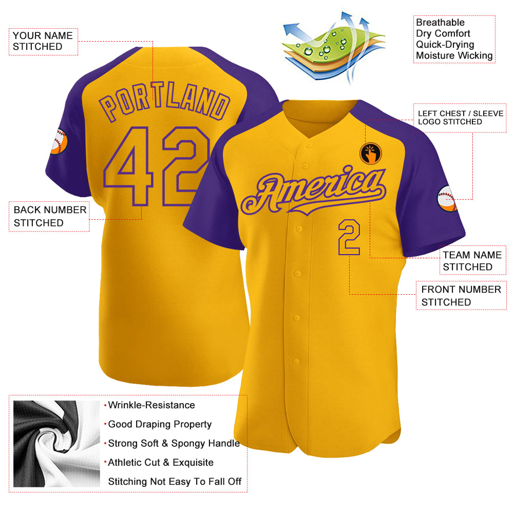 Custom Gold Purple Authentic Raglan Sleeves Baseball Jersey