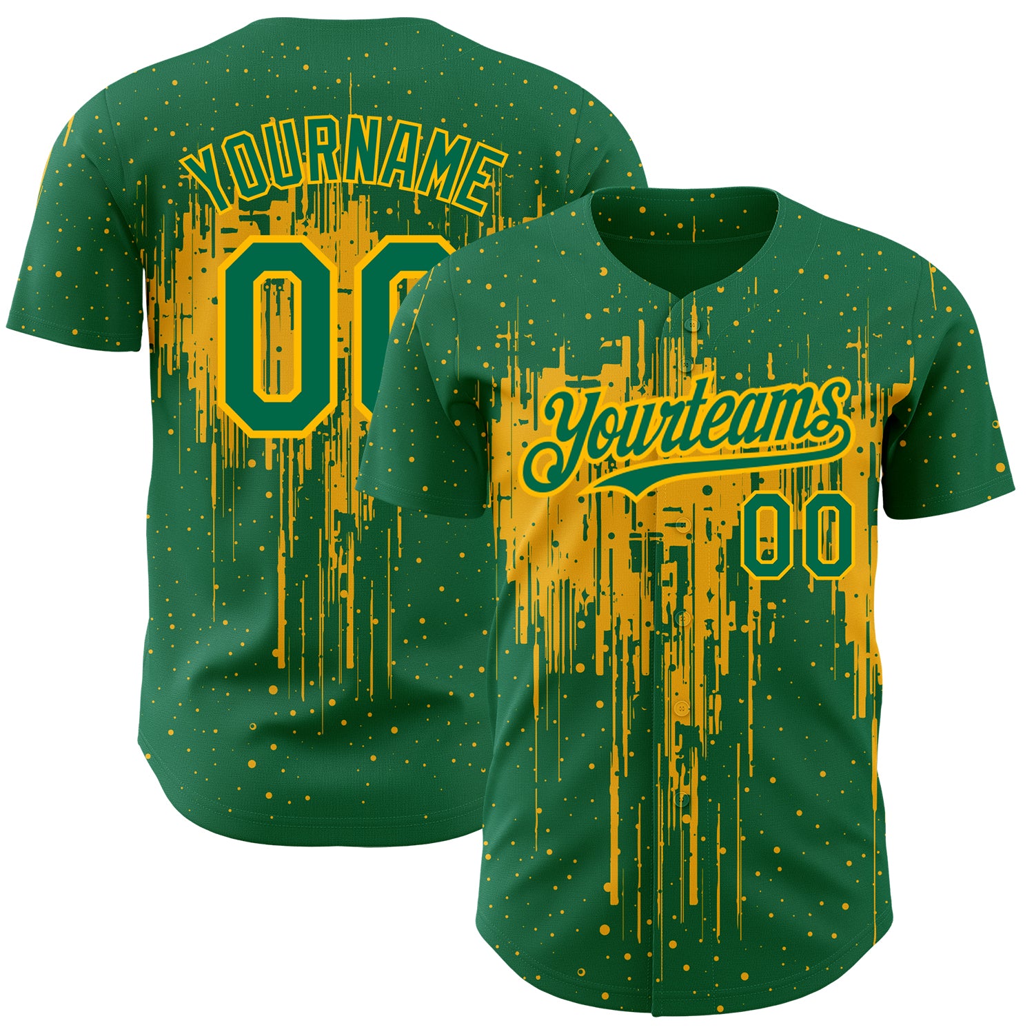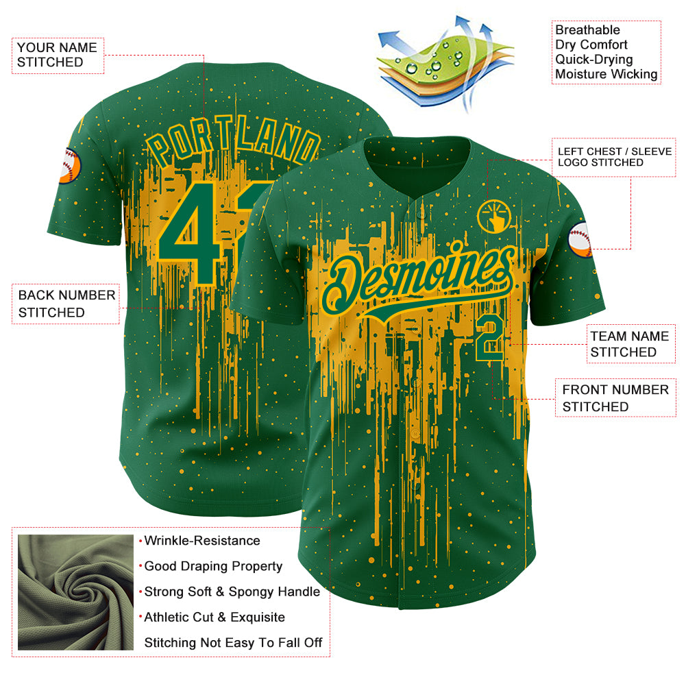 Custom Kelly Green Gold 3D Pattern Design Dripping Splatter Art Authentic Baseball Jersey