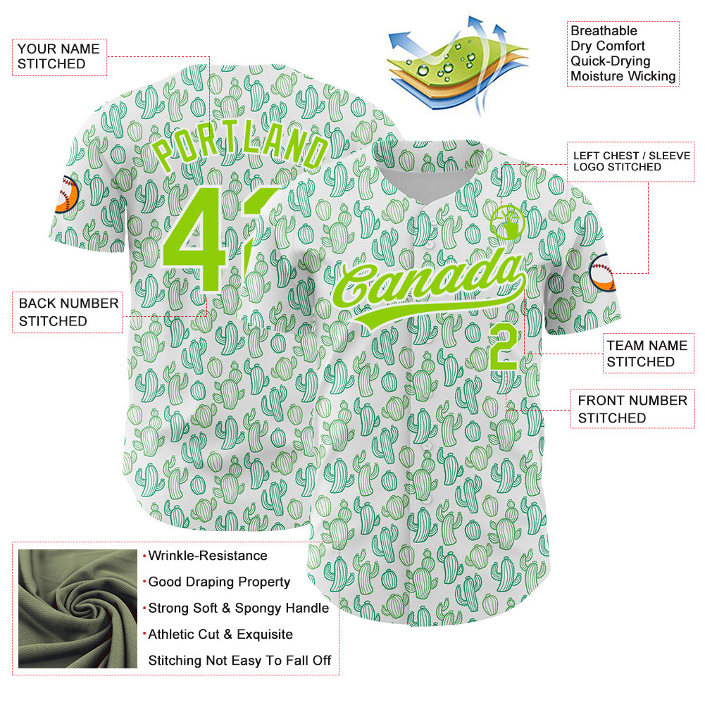 Custom White Neon Green 3D Pattern Design Cactus Festival Authentic Baseball Jersey