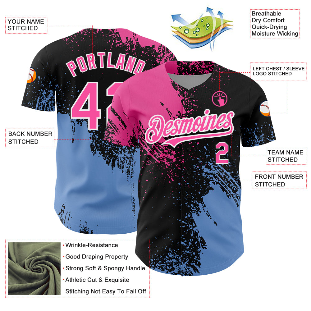 Custom Black Pink-Light Blue 3D Pattern Design Abstract Brush Stroke Authentic Baseball Jersey