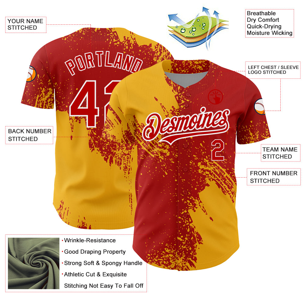 Custom Red Gold-White 3D Pattern Design Abstract Brush Stroke Authentic Baseball Jersey