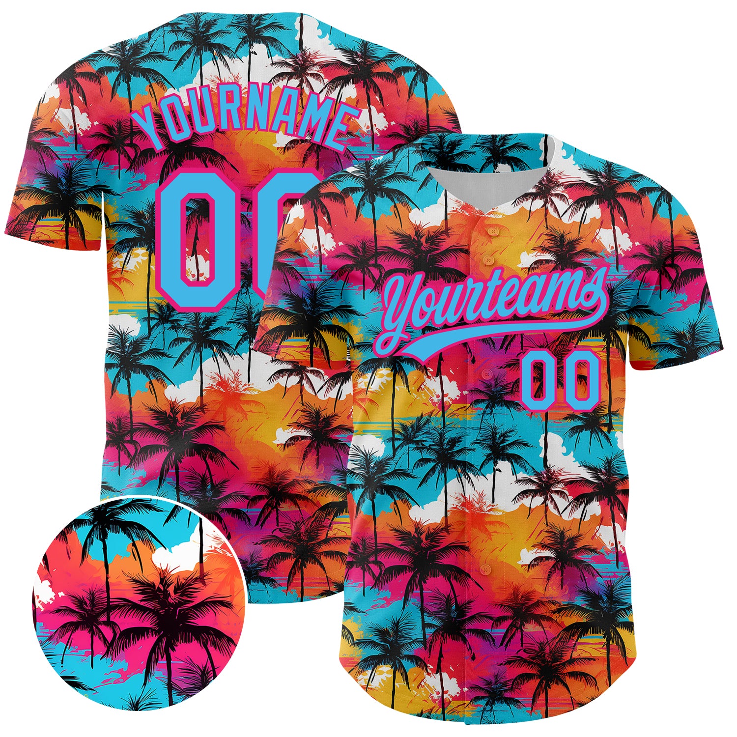 Custom Sky Blue Hot Pink 3D Pattern Design Tropical Hawaii Palm Trees Authentic Baseball Jersey