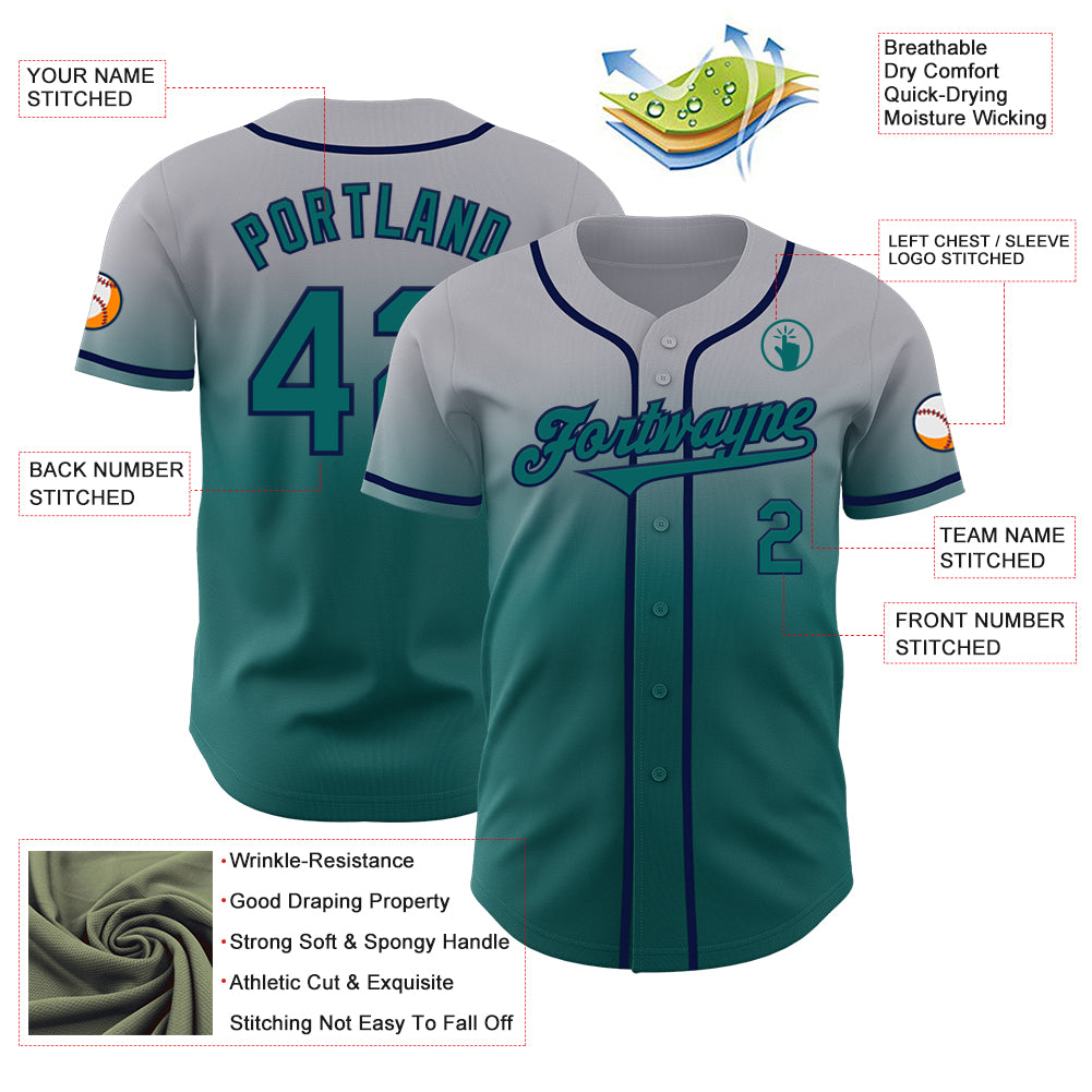 Custom Gray Teal-Navy Authentic Fade Fashion Baseball Jersey