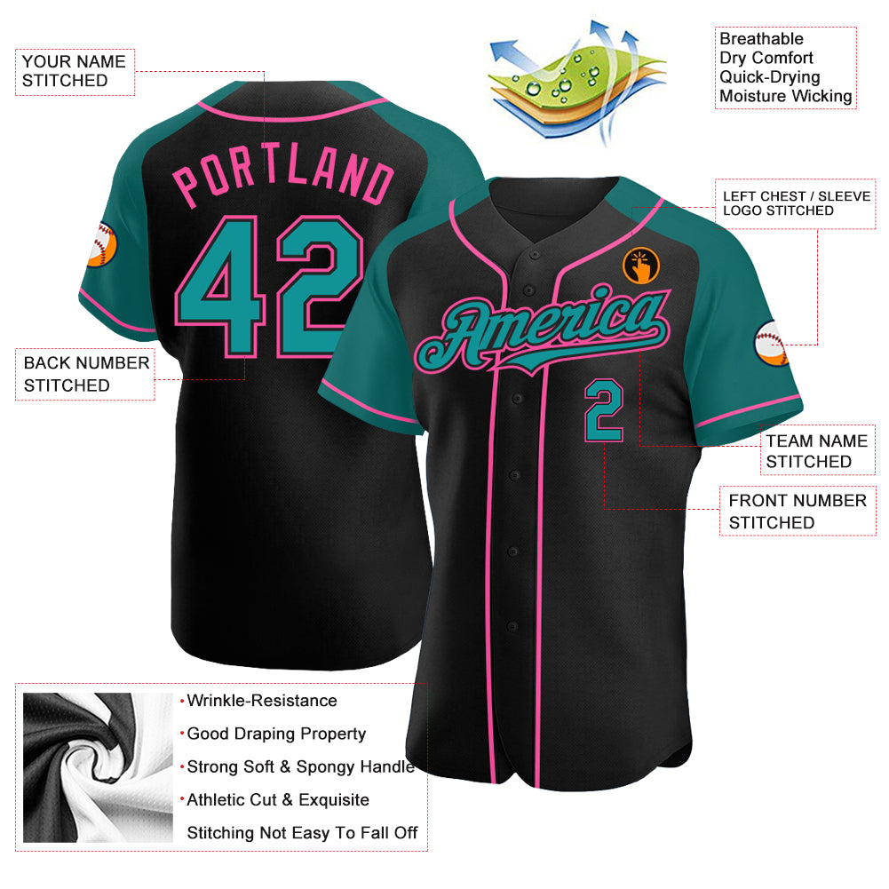 Custom Black Teal-Pink Authentic Raglan Sleeves Baseball Jersey