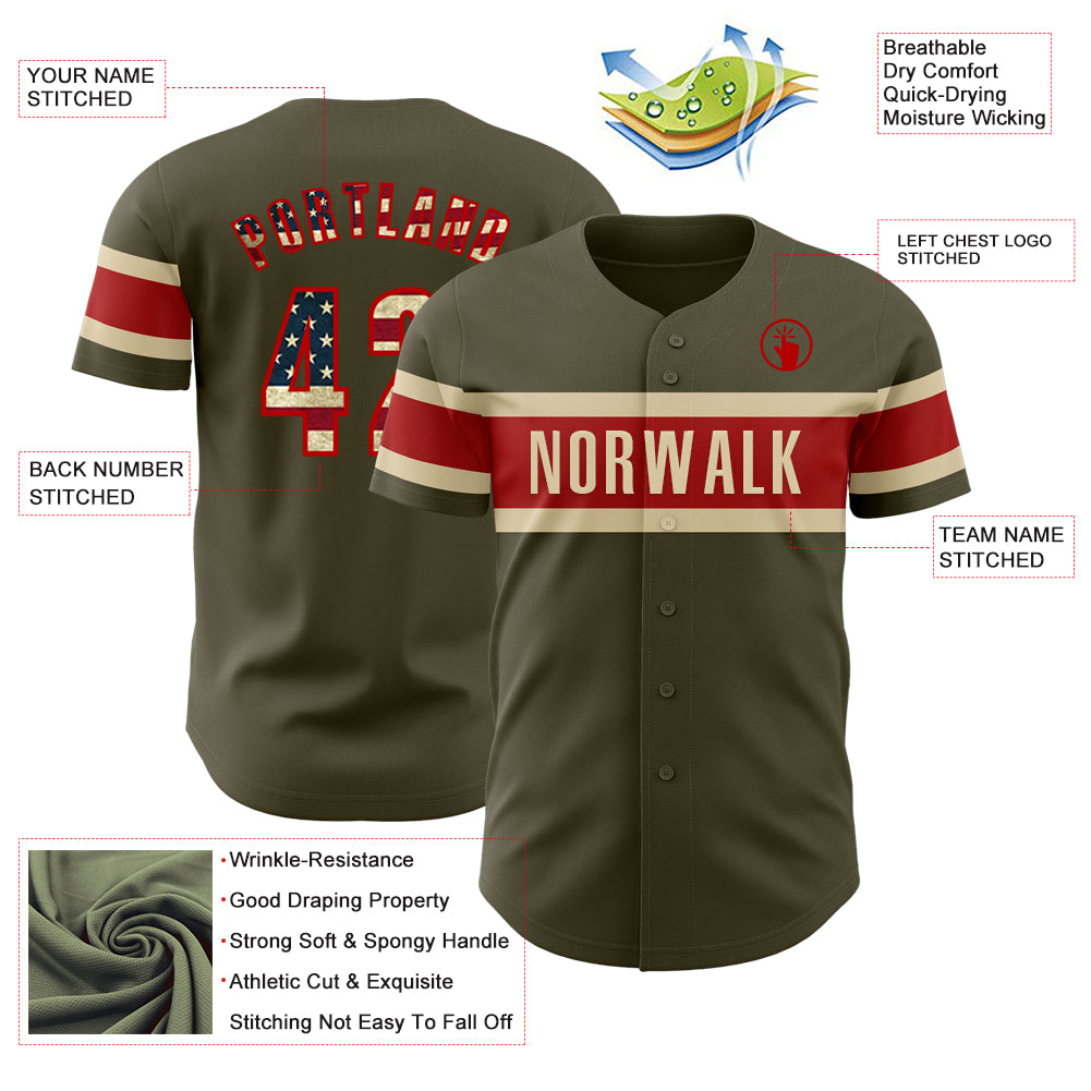 Custom Olive Vintage USA Flag Red-Cream Authentic Salute To Service Baseball Jersey