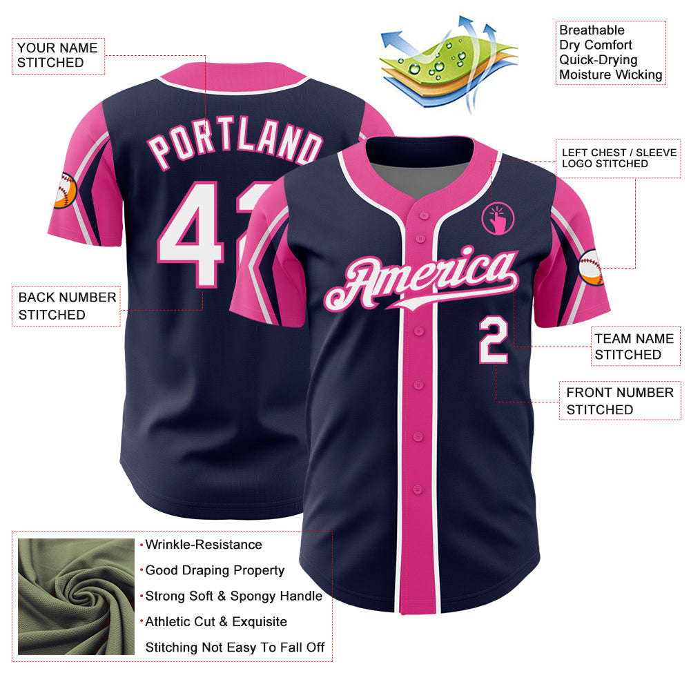 Custom Navy White-Pink 3 Colors Arm Shapes Authentic Baseball Jersey