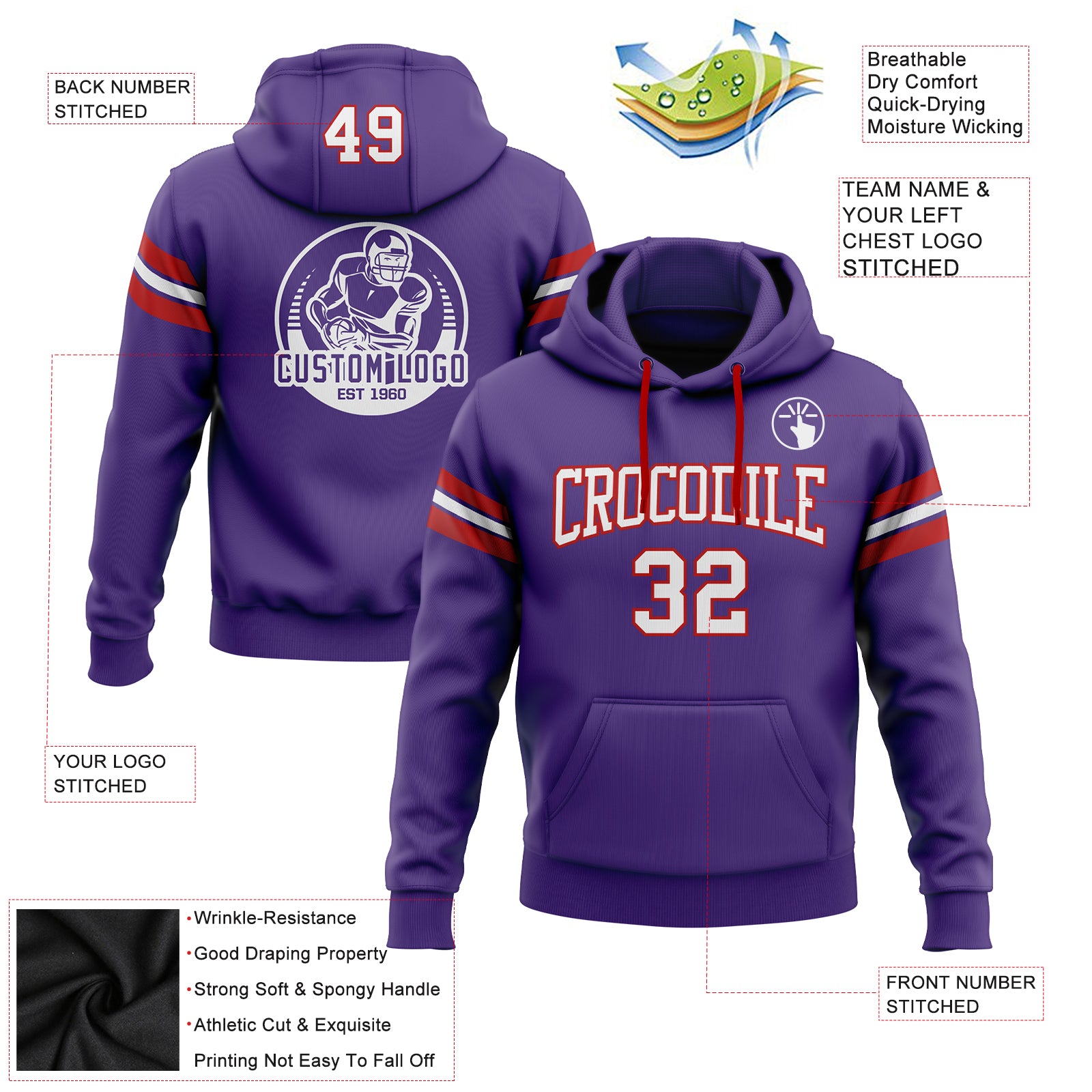 Custom Stitched Purple White-Red Football Pullover Sweatshirt Hoodie