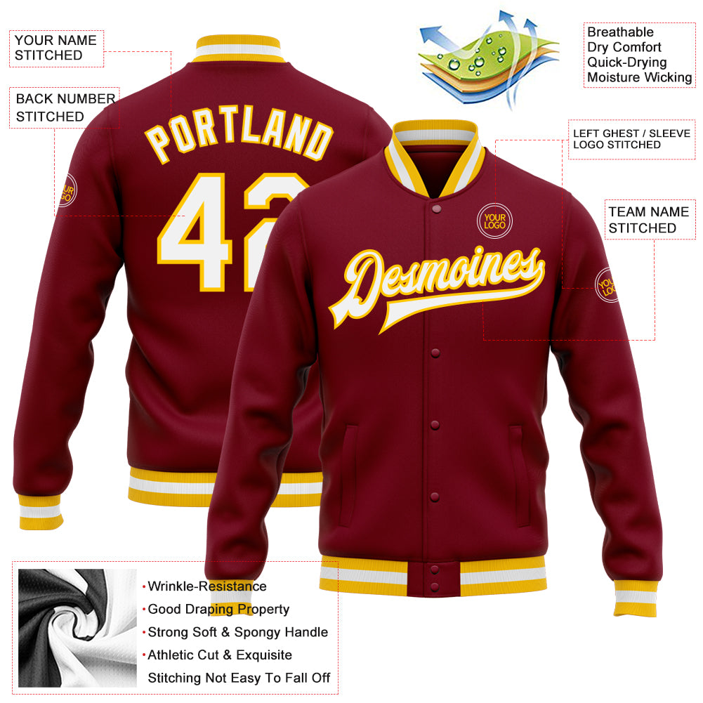 Custom Crimson White-Gold Bomber Full-Snap Varsity Letterman Jacket