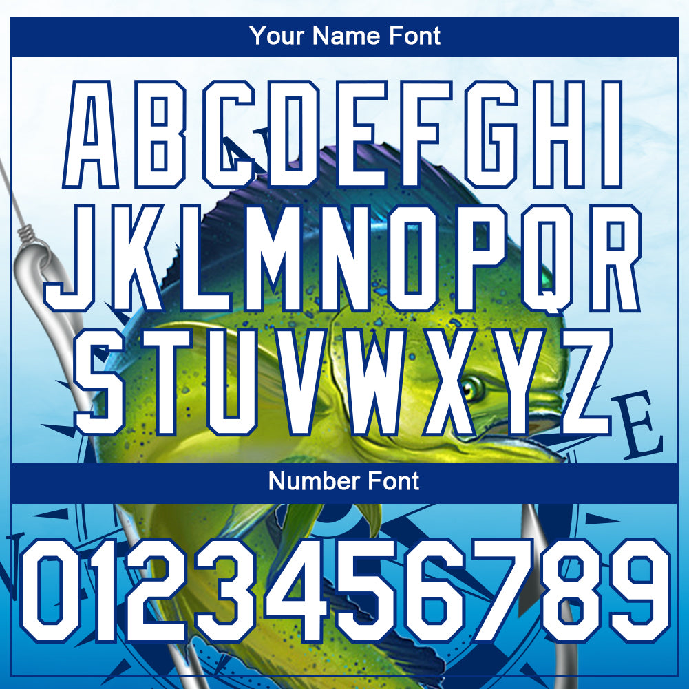 Custom Lakes Blue White-Royal Mahimah Fish Fishing 3D Bomber Full-Snap Varsity Letterman Hoodie Jacket